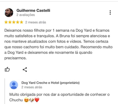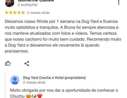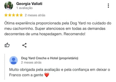 Na Dog Yard, seu pet é tratado com respeito e amor. Oferecemos hospedagem livre de gaiolas para que seu melhor amigo se sinta em casa.